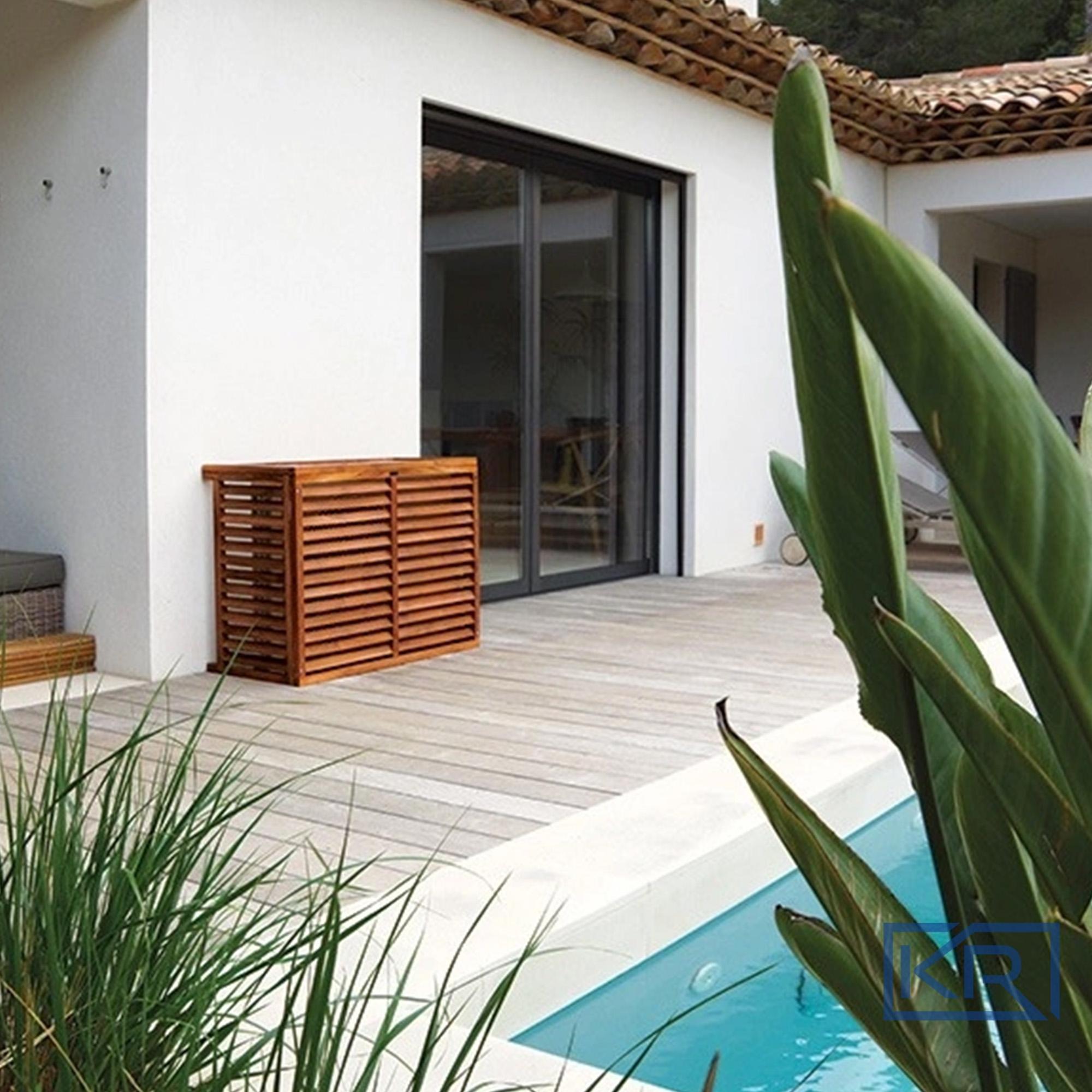 Decoclim – Design-Motorabdeckung für Klimaanlagen & Wärmepumpen Die Decoclim-Abdeckung versteckt und schützt den Aussenmotor Ihrer Klimaanlage oder Wärmepumpe – stilvoll, wetterfest und geräuschreduzierend. Erhältlich in Aluminium (weiss oder grau) oder FSC-Exotenholz, fügt sie sich harmonisch in jede Umgebung ein. Dank durchdachter Belüftung bleibt die Luftzirkulation optimal, während Regenwasser zuverlässig abgeleitet wird. Robust gegen UV-Strahlen, Rost und Temperaturschwankungen, mit Edelstahlschrauben und 10 Jahren Garantie. Zudem wirkt Decoclim schalldämmend und reduziert Motorgeräusche – für mehr Ruhe und ein gepflegtes Gesamtbild.